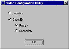 This allows you to select which video renderer to use. If you have no 3D video acceleration, then you should select "Software". If you have a video accelerator card and DirectX 7.0 or later installed, select "Direct3D". If you have a Voodoo, Voodoo 2, or some other secondary card, select "Secondary". Otherwise choose "Primary".