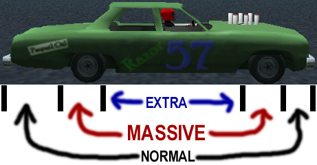 Demolition Derby strategy is a little more subtle. First off, cars take more damage when hit on the side than the front. Here are their damage zones:
